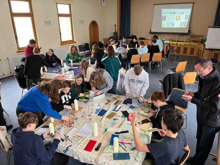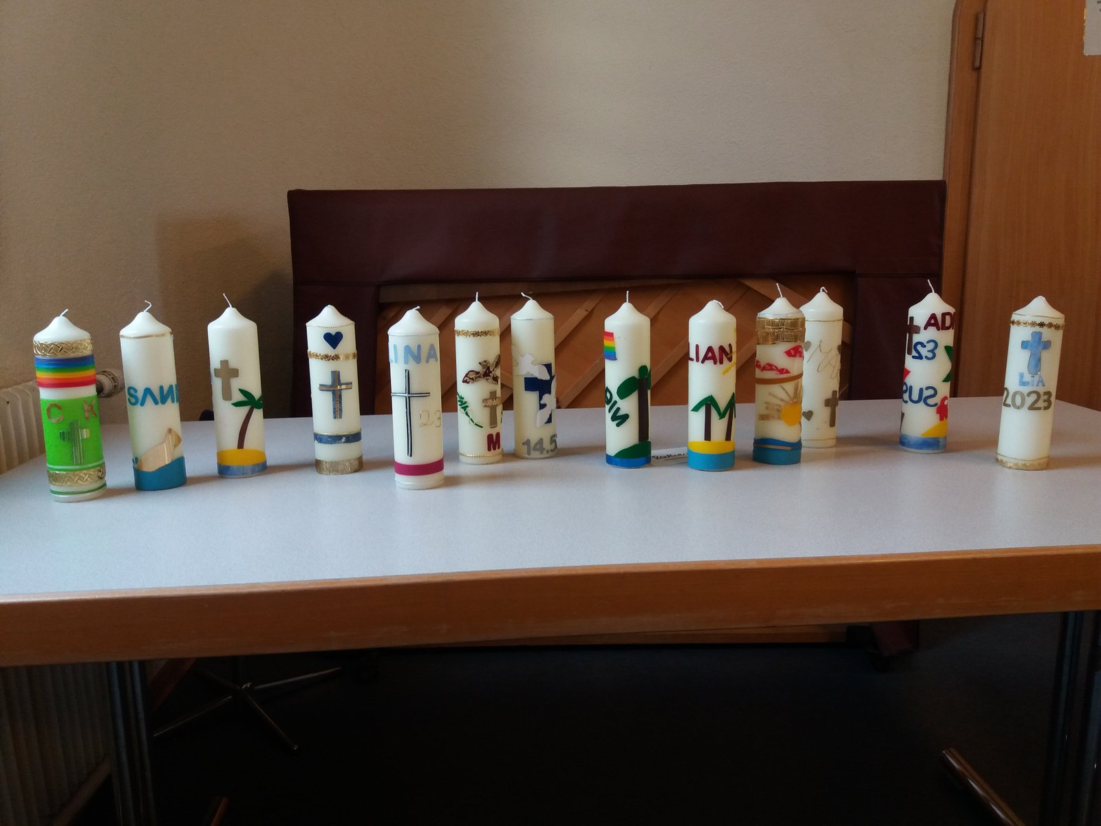 Zur Mittagszeit stärkten sich alle mit Pizza und der Nachmittag blieb der Gestaltung der Konfirmationskerzen vorbehalten. In den Rosbacher Gemeinden hat das Verzieren und Verwenden von Konfirmationskerzen schon Tradition, während wir diese Kerzen in Rodheim bei der Konfirmation am 14.05.2023 zum ersten Mal leuchten sehen werden.